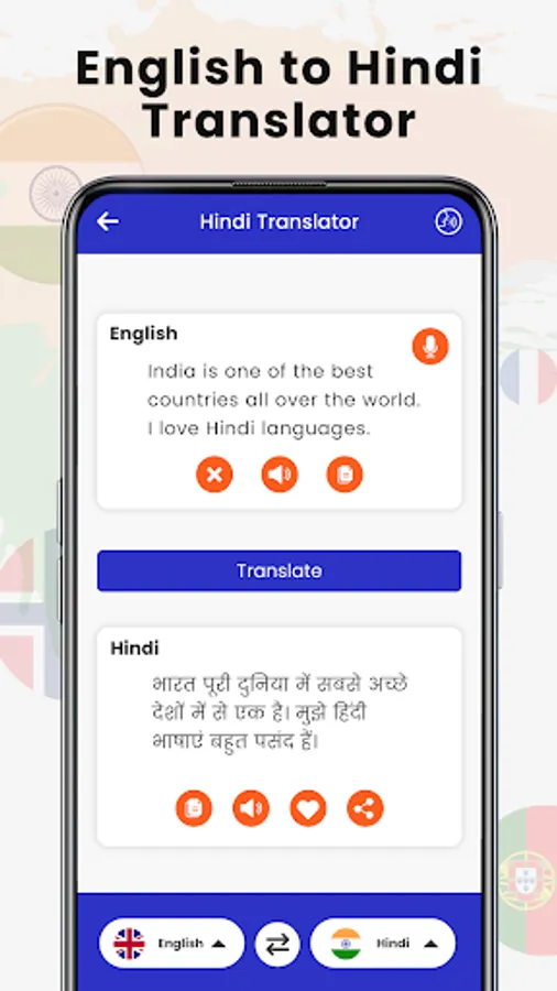 Hindi to English translator is one of the best Hindi to English Translation apps to translate Hindi and English language text to any language. Text Translator app helps to translate text and speech, translate English to Hindi, translate Hindi to Spanish, translate Hindi to English, and translate text into Hindi from English.