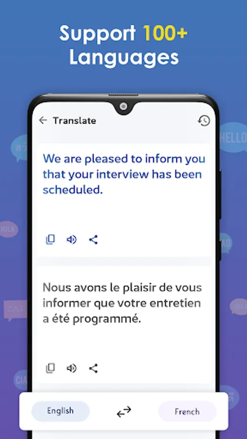 Language translator app with a simple user interface can translate any language text, voice, or speech into more than 100 languages.