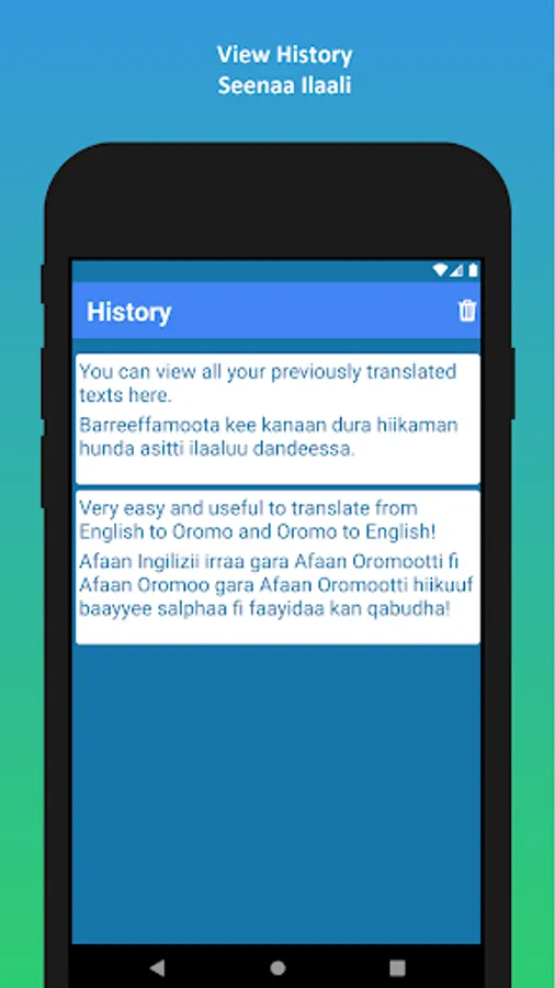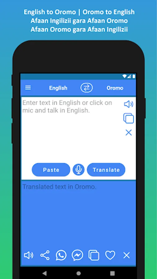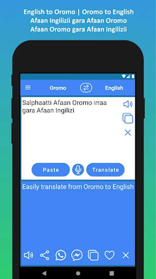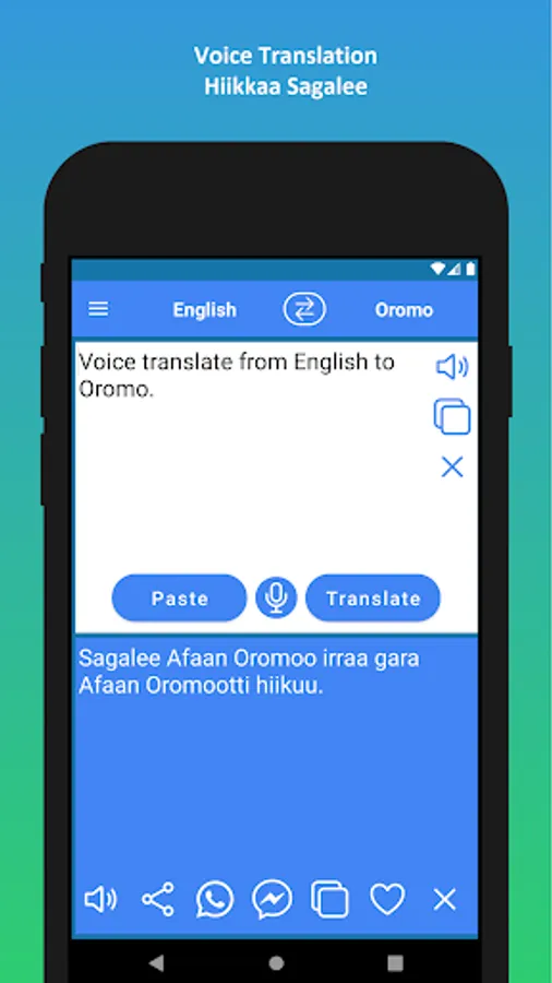 ✓ Using inbuilt voice recognition technology, you can type your text using your voice and then translate the text. This convenient feature allows you to translate regular conversations. You can translate your English voice to Oromo and Oromo voice to English.