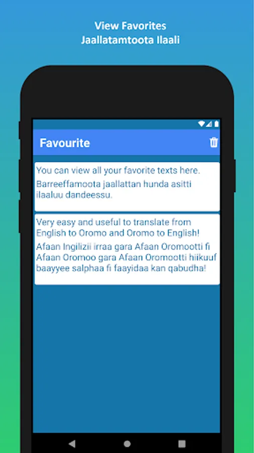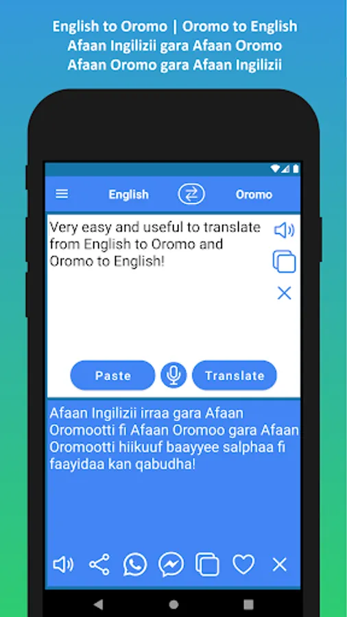 ✓ Use it as a Dictionary. You can type your words in English and get the exact word in Oromo. You can type your words in Oromo and get the exact word in English.