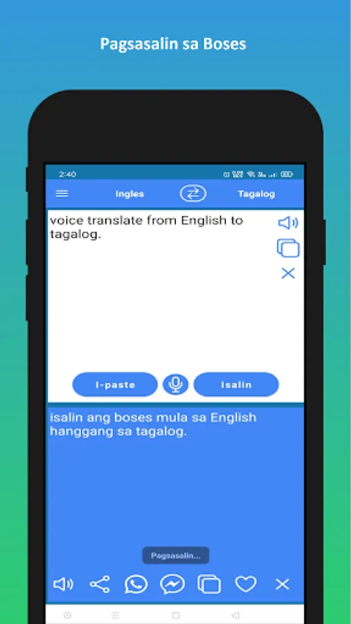 ✓ Using inbuilt voice recognition technology, you can type your text using your voice and then translate the text. This convenient feature allows you to translate regular conversations. You can translate your English voice to Tagalog and Tagalog voice to English.