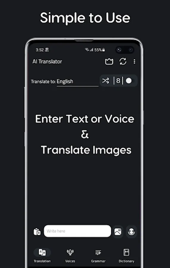 • Direct Voice Translation: Translate texts instantly between two different languages using voice input.