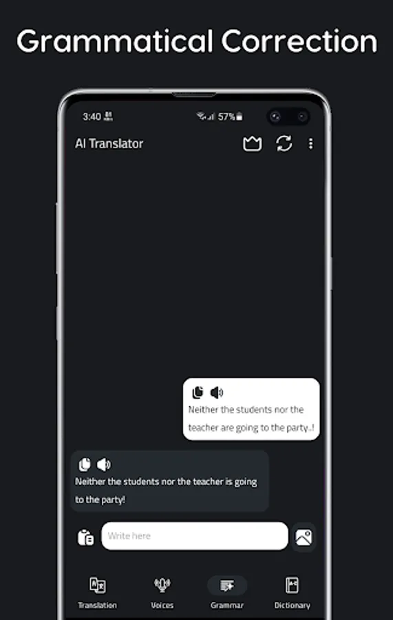 • Spelling, Grammar, and Conjugation Correction: No need to worry about errors in your writing. The app powered by AI automatically detects and corrects spelling and grammar mistakes, along with enhancing sentence structure and formulation.