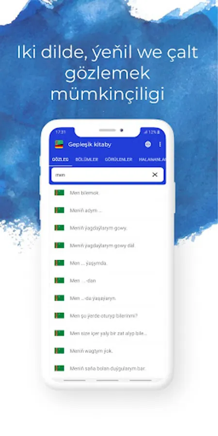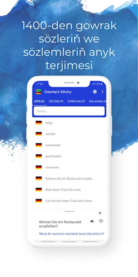 The "Turkmen-German phrasebook" contains over 1400 of the most common words and phrases. They will serve you well on trips, in meeting with foreigners, in emergency situations and in many other cases.