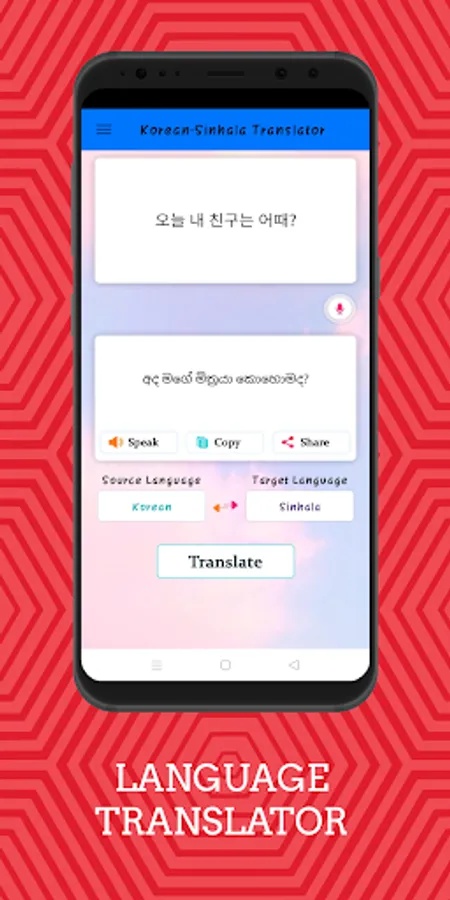 The Sinhala to Korean translator application has a wonderful component of speaker symbol that when you translate Sinhala or Korean text or document or file or voices the translated Sinhala or Korean word or document result is translated in their after emphasizes you tap on the speaker symbol.