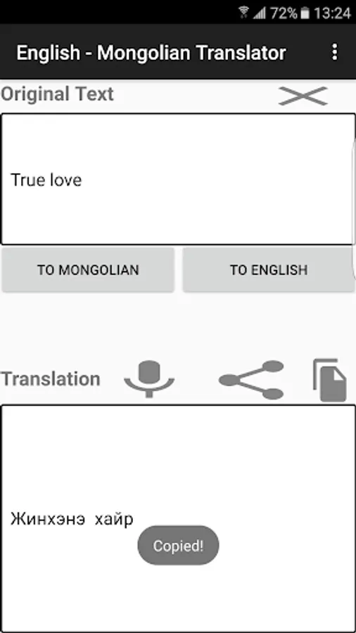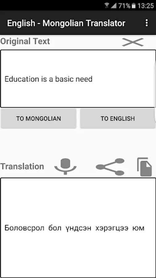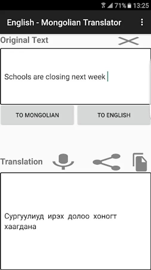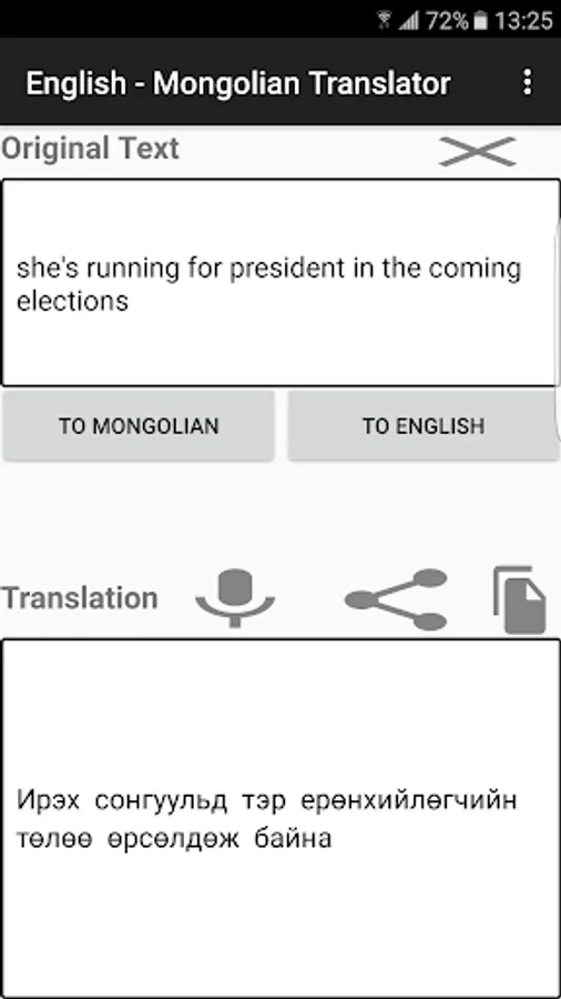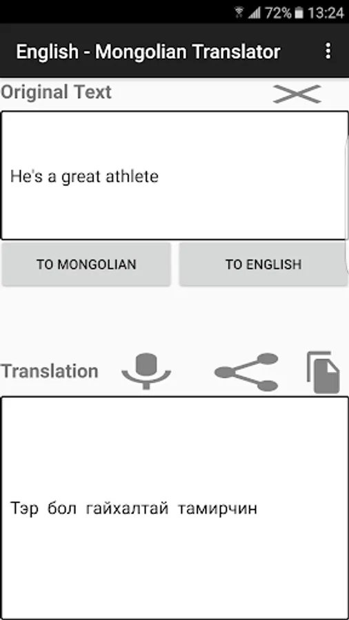 Learning Mongolian or visiting a Mongolian speaking country? Ease your learning/communication by translating any English or any other language word/sentence to Mongolian .