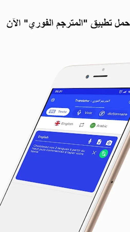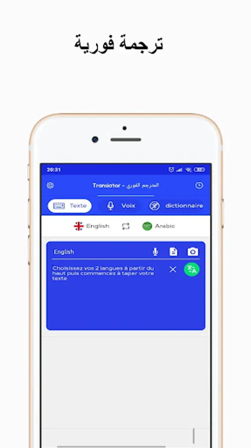 The instant translator is the best translator from and into Arabic and to all languages of the world, he translates text with high accuracy and has text and voice translation