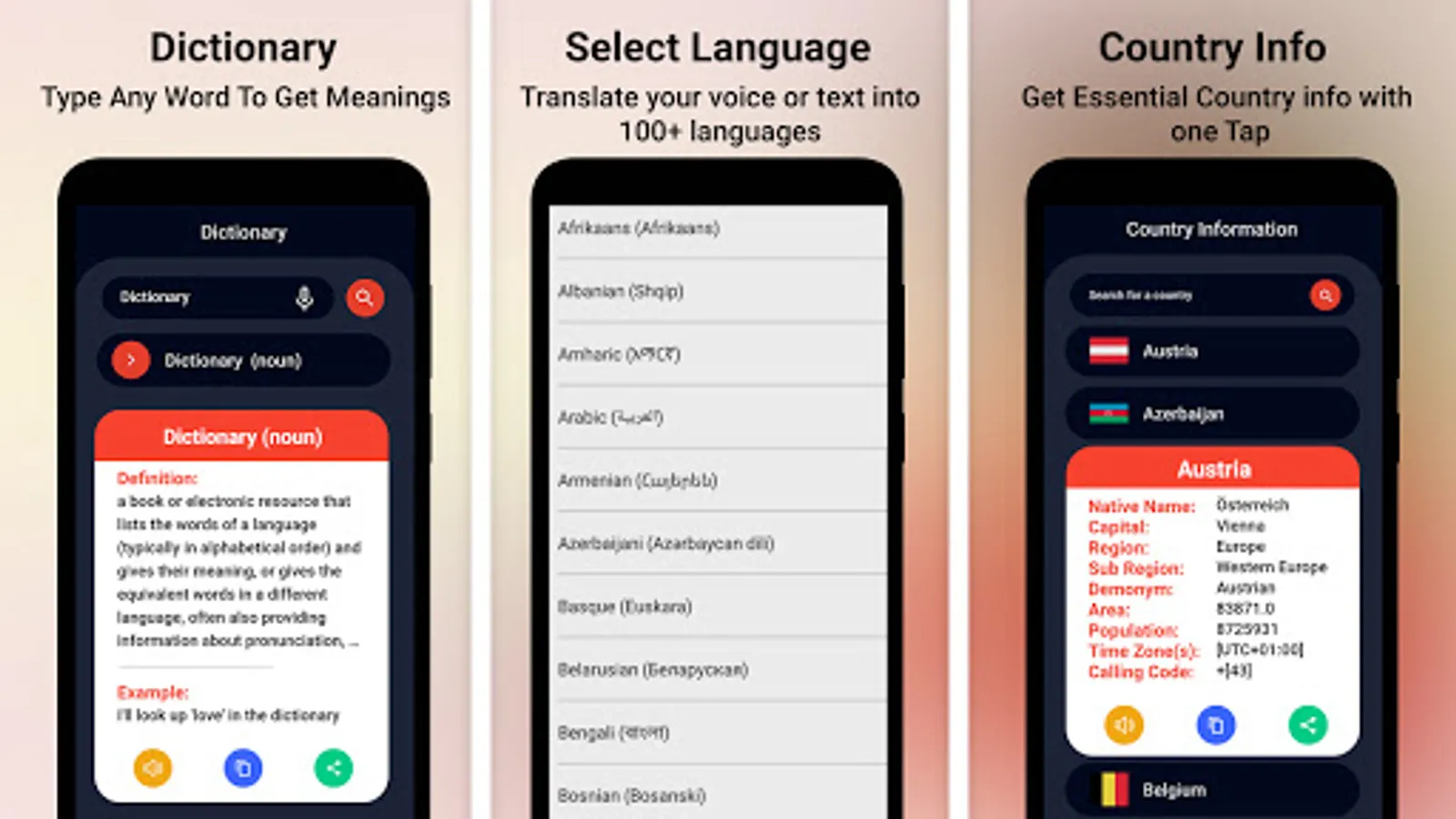 Our Translate app work with the help of camera translator, voice translator and text translator. Translator all language user just speaks what he needs to translate and our app translate it with the help of translator keyboard. The most translated languages are Spanish to English translator and English to Spanish translator. Language translator translate different language in just one click. If you are in some other country and you want to explore native areas of that country our translator all languages got you covered. All language translator also act as a Spanish translator.