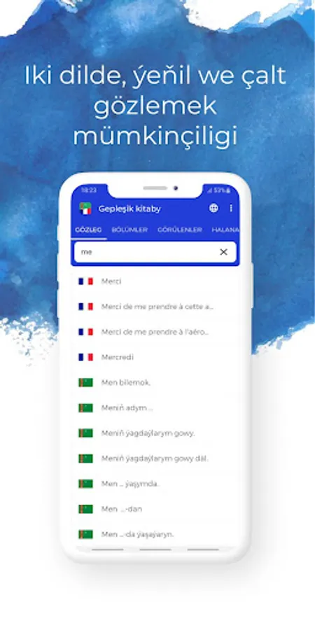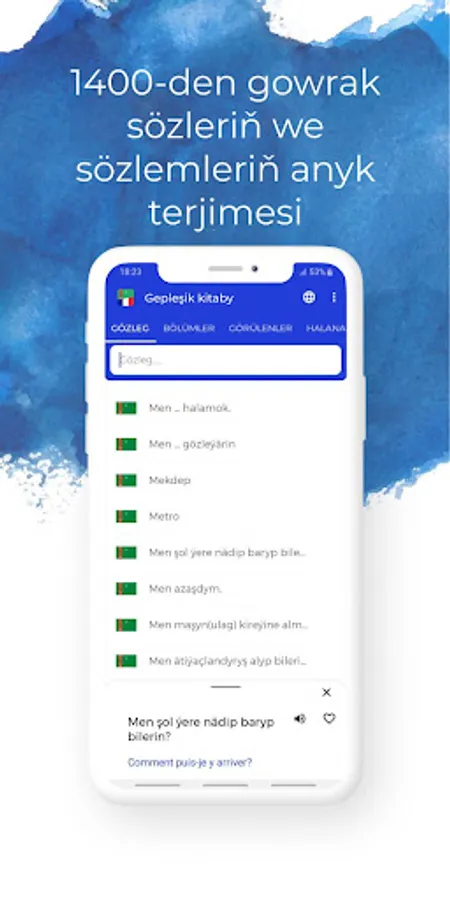 The "Turkmen-French phrasebook" contains over 1400 of the most common words and phrases. They will serve you well on trips, in meeting with foreigners, in emergency situations and in many other cases.