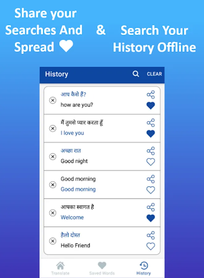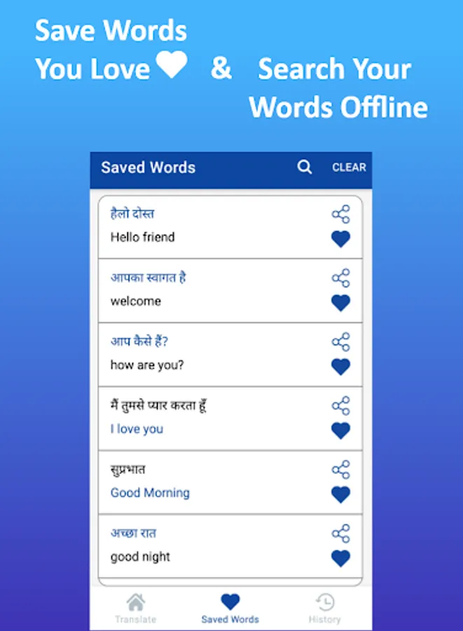 With this FREE and easy translator, you can save your searches or look at them in your history while being offline. In this way you can use them whenever you wish.