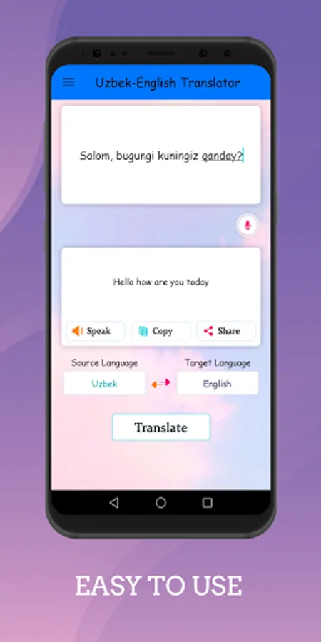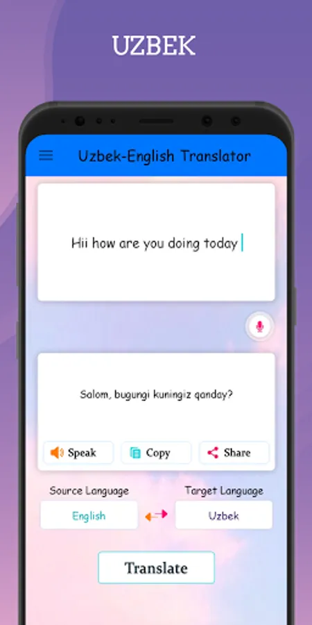 The Uzbek to English translator app is capable of translating Uzbek text, letter, word, sentence, paragraph, or copied clipboard text into Uzbek to English language or English to the Uzbek language. You just need to write down or copy-paste the text you want to translate Uzbek.