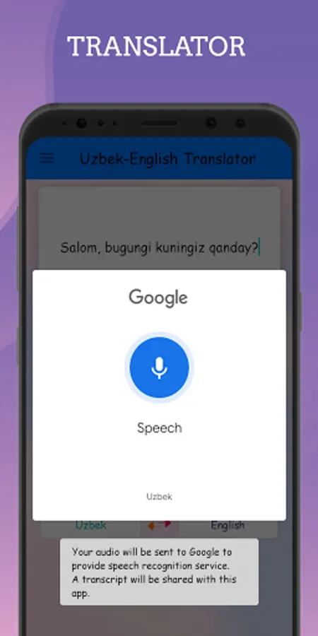 A wonderful feature of the Uzbek to English translator app is the voice translator. First press the microphone icon and speak up the word or sentence you want to get translated. The mic will catch up with the voice and will translate Uzbek words into English or English to Uzbek.