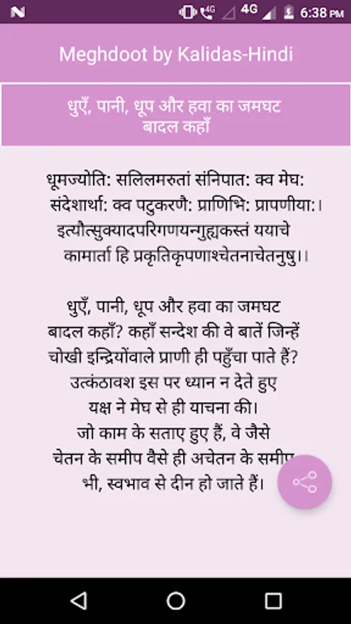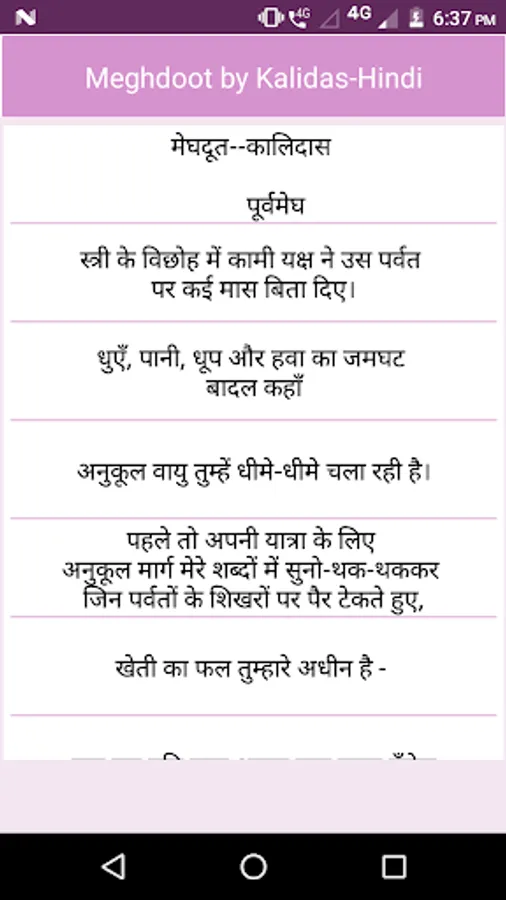 A poem of 111 stanzas, it is one of Kalidasa's most famous works. The work is divided into two parts Purvamegh and Uttaramegh. It recounts how a yaksha a subject of King Kubera (the god of wealth), after being exiled for a year to Central India for neglecting his duties, convinces a passing cloud to take a message to his wife at Alaska on Mount Kailasa in the Himalaya mountains.
