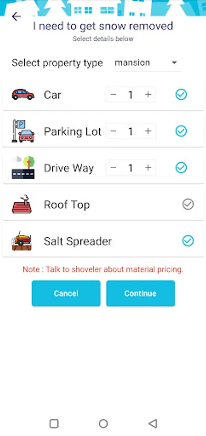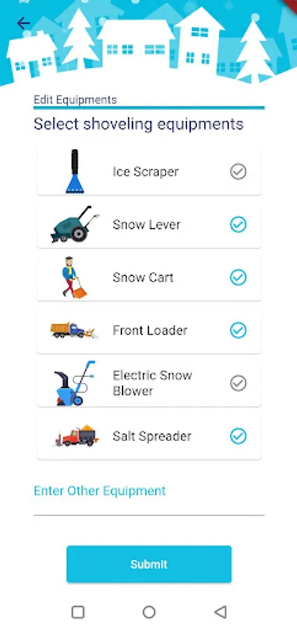Shoveler can select the type of equipment they have to give a better idea to the customer of what could be used to remove the snow, including heavy equipment for snow removal.