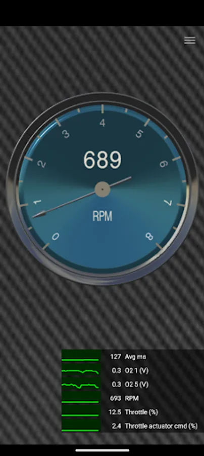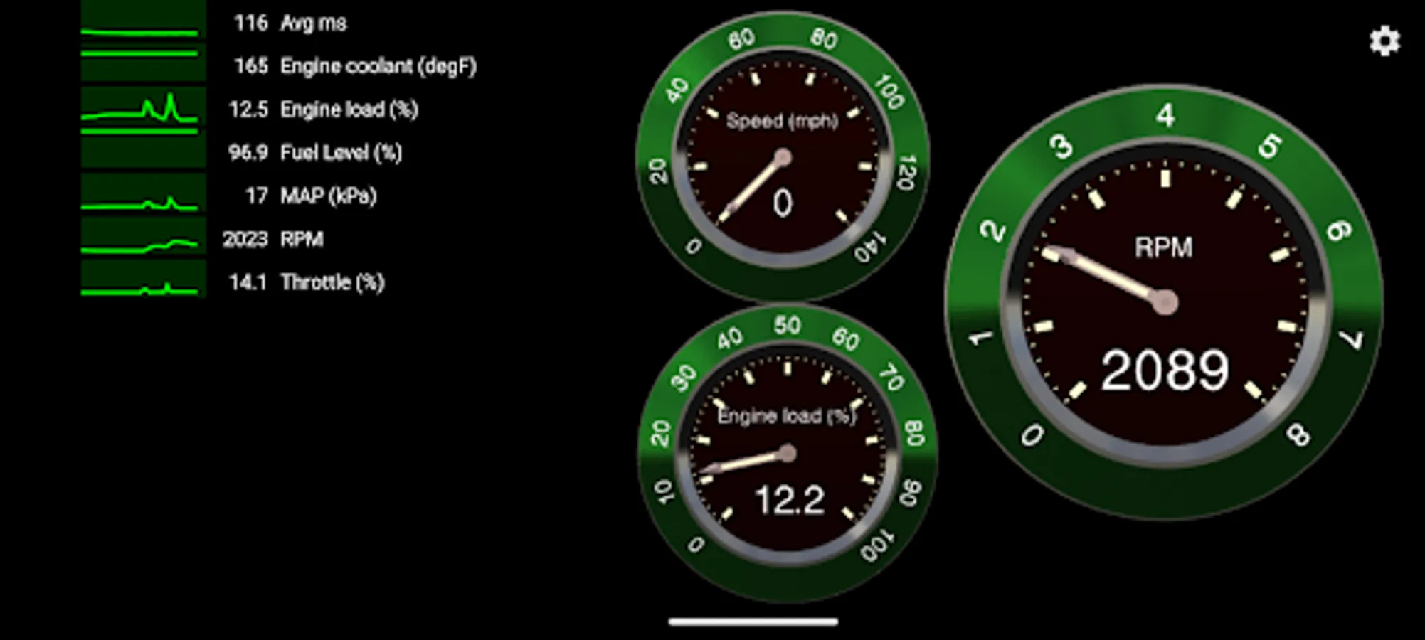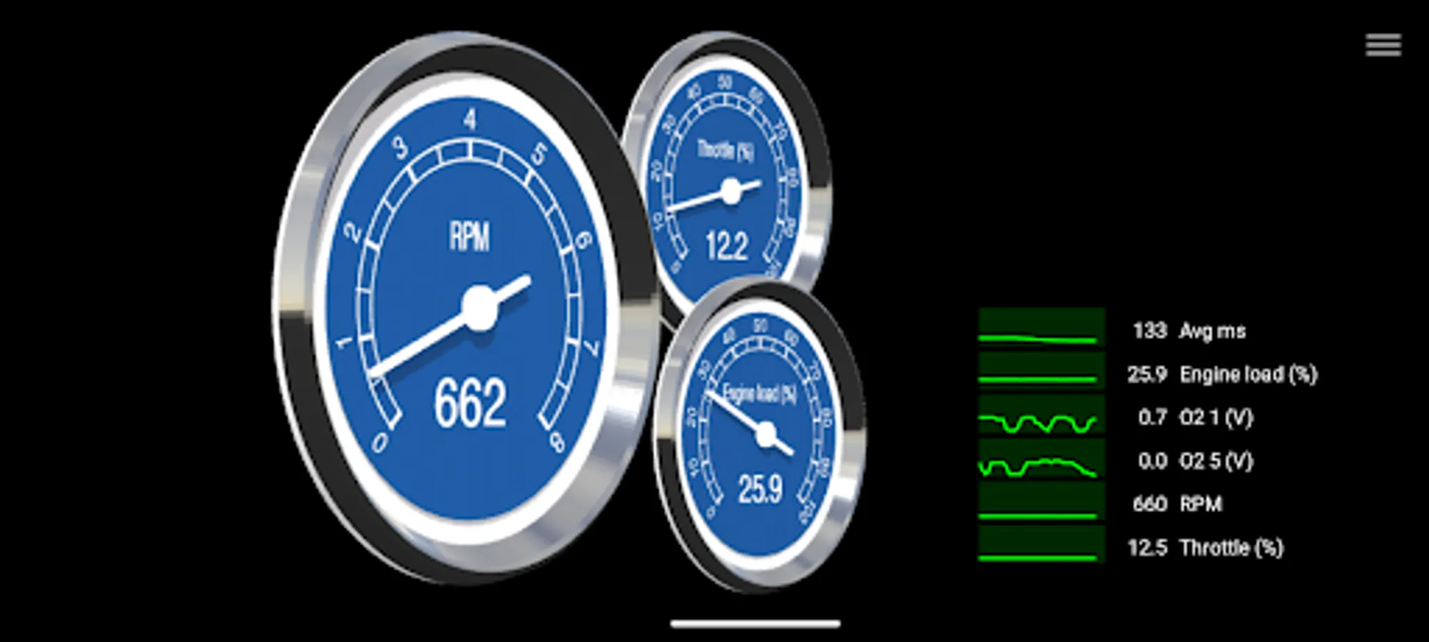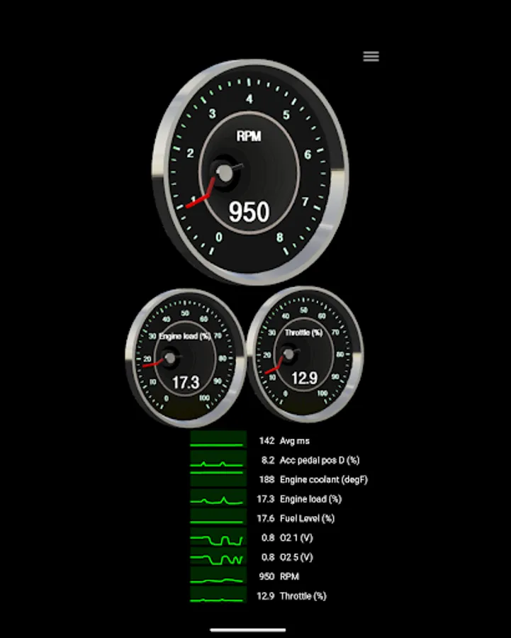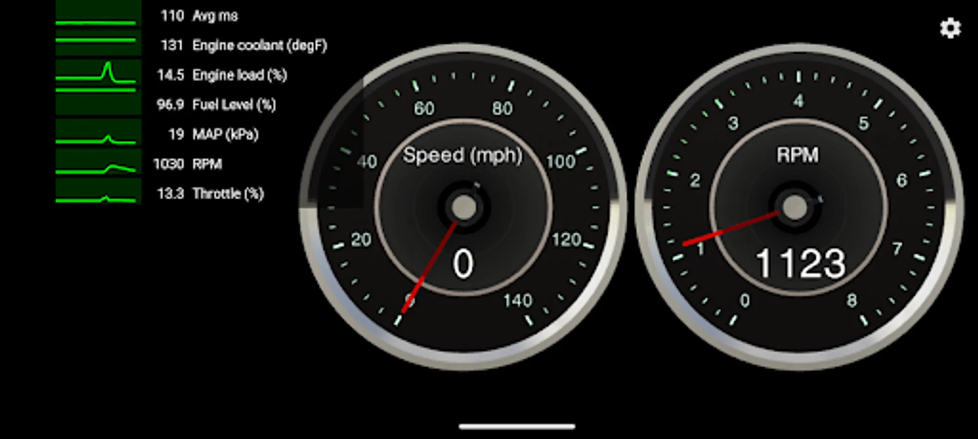 View OBD2 data (varies by vehicle) such as vehicle speed, RPM, estimated torque, coolant temperature, intake air temperature, remaining fuel percentage, and many more.