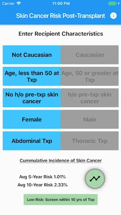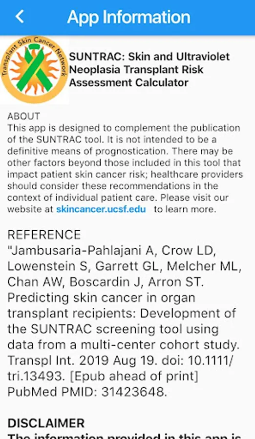 This app is designed to complement the publication of the SUNTRAC tool. It is not intended to be a definitive means of prognostication. There may be other factors beyond those included in this tool that impact patient skin cancer risk; healthcare providers should consider these recommendations in the context of individual patient care.