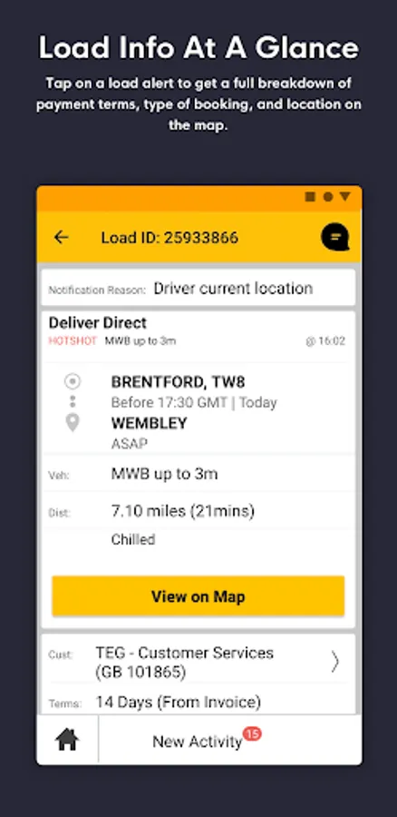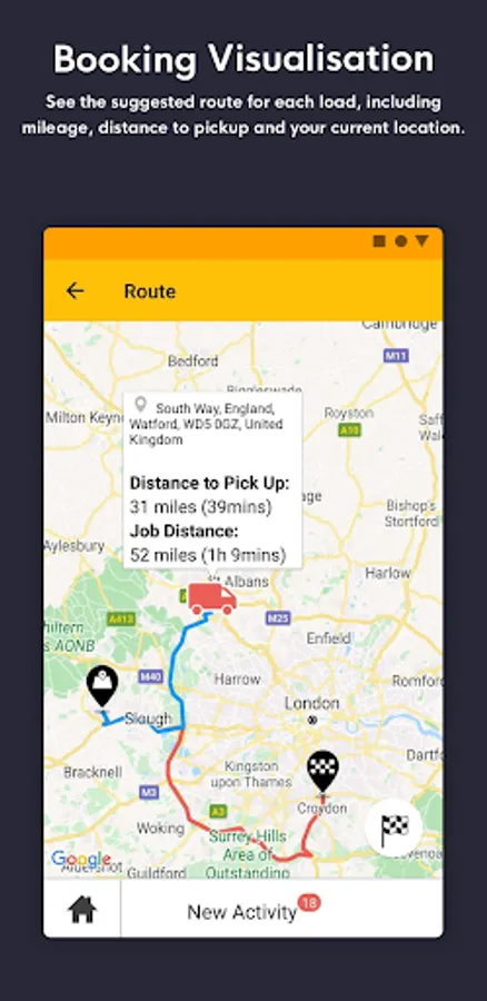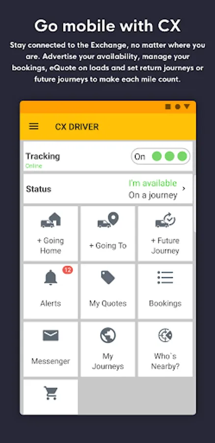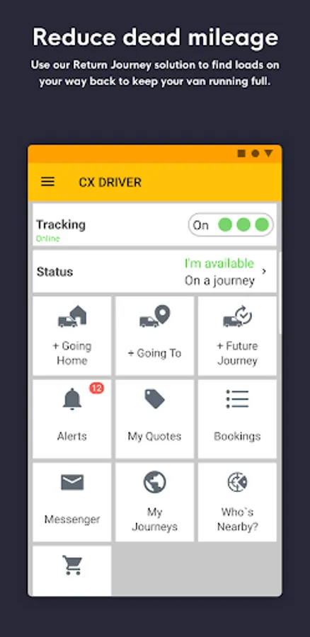 You can register your journeys directly from the Courier Exchange mobile app using our 1-Click journey registration. Loads are automatically matched with your journey route and notifications are sent to you or your controller.