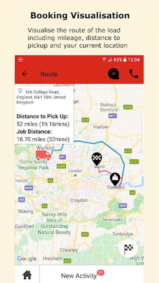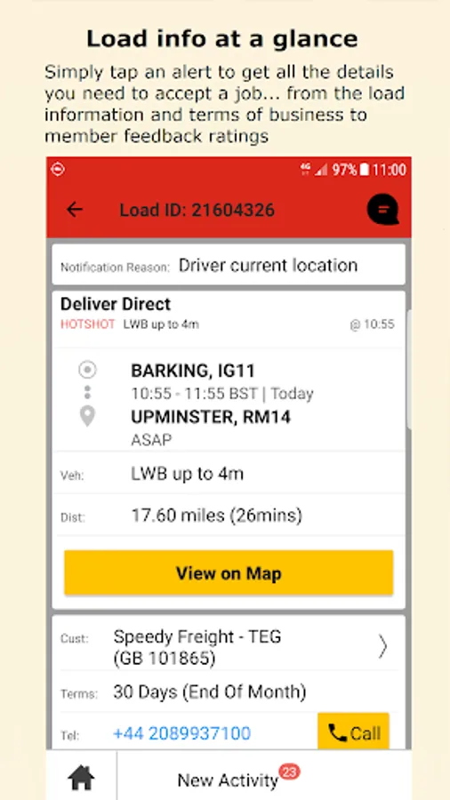 Update the booking on the Mobile app using our 2-tap status update feature. This sends a date and time stamp to the controller for the 4 main milestones of a delivery; On Site - pickup, Loaded, On Site - delivery, POD.