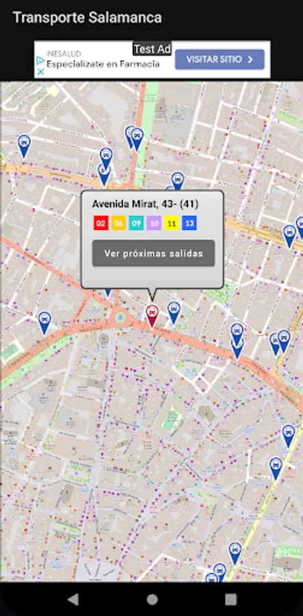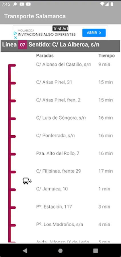 Based on the data offered online by Salamanca de Transportes S.A. Through its website (salamancadetransportes.com) Transporte Bus Salamanca deduces the position of each deployed bus and shows it on the screen. This way you will not only know how much time your bus has left to arrive, but also where it is at all times, obtaining a much more realistic view than simple time data.