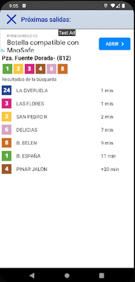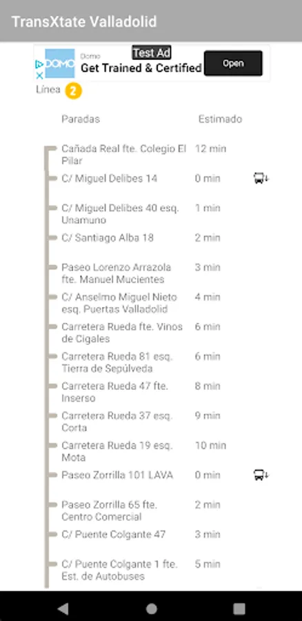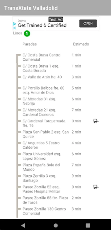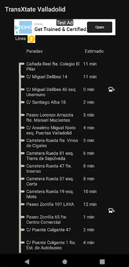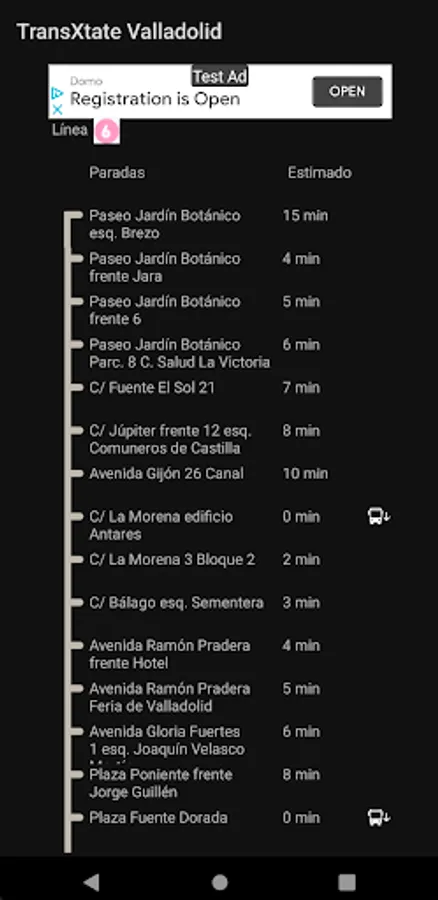 From the data offered online by AUVASA through its website, TransXtate Bus Valladolid deduces the position of each deployed bus and displays it on the screen. This way you will not only know how much time your bus has left to arrive, but also where it is at the moment, obtaining a much more realistic view than simple time data.