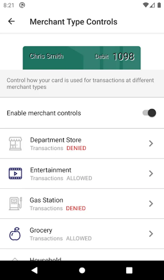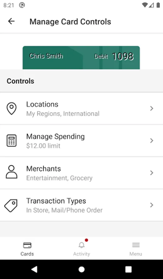 Spending limits can be established to allow transactions up to a certain dollar value and decline transactions when amounts exceed your defined thresholds. Transaction can be monitored and managed for specific merchant categories such as gas stations, department stores, restaurants, entertainment, travel and groceries. And you transaction can also be monitored for specific transaction types in store purchases, e-commerce transactions, mail/phone orders and ATM transactions.