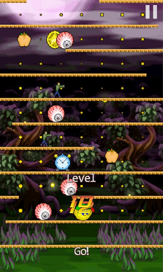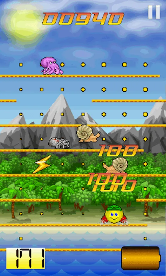 Avoid monsters, but you can jump from upper platform on monster to destroy it. Collect fruits and power ups.