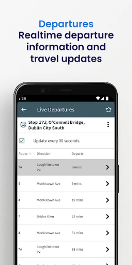 • Ability to view Real Time departure information for Bus Éireann, Dublin Bus, Go Ahead Ireland, Luas, Iarnród Éireann Irish Rail and other TFI services;