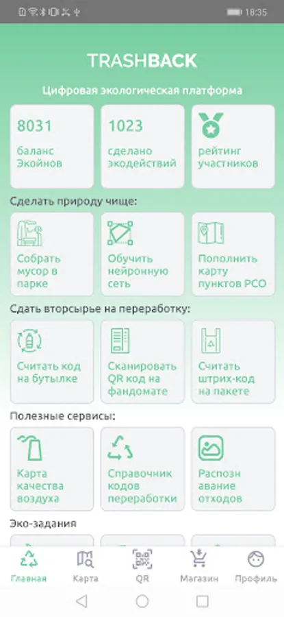 The application allows your family to sort waste profitably - to receive bonus points (ecoins) for recyclable materials handed over, marking photographs of waste and other actions that are beneficial to the environment. Also, using the application, you can donate waste in fandomats with artificial intelligence from TrashBack