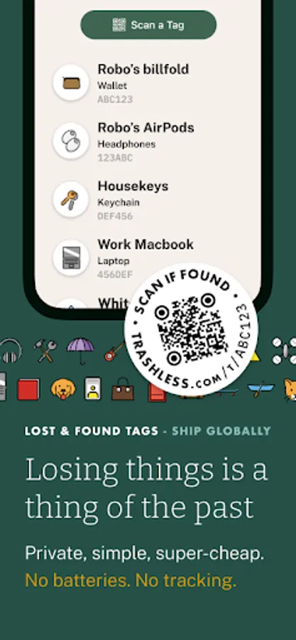 2. LOST & FOUND TAGS help lost items get back to you, easily and privately. They are strong adhesive vinyl stickers that you simply STICK to your personal items, and quickly SET it up in this app. Then, if you lose the item, the finder can scan the unique QR code and communicate with you ANONYMOUSLY and share the location of the item.