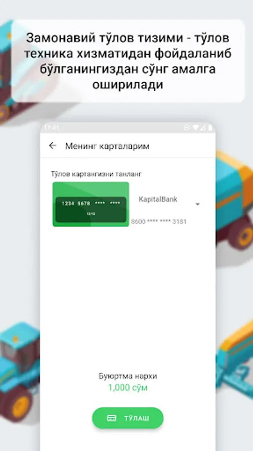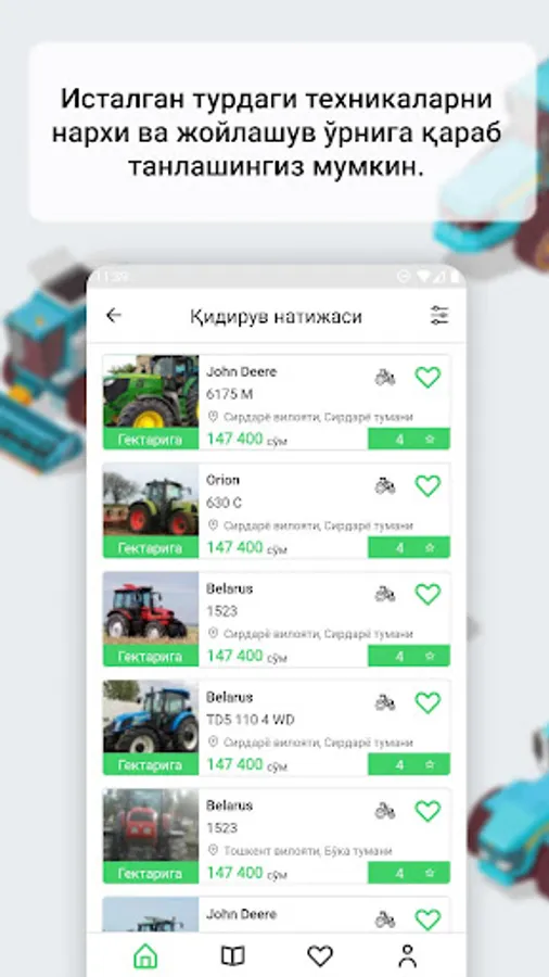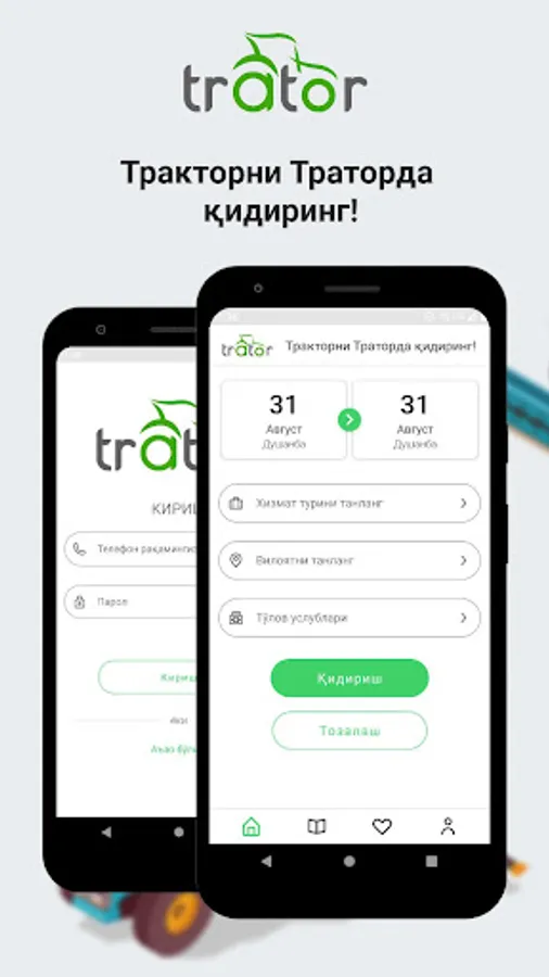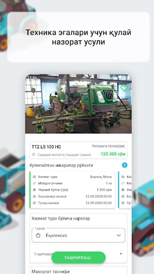 Ekin maydoningizda agricultural technician tadbirlarni amalga oshirish biicha technician hizmatlaridan foydalanmoқchimisiz? Istalgan қishloқ khўzhaligi tekhnisini malum bir muddatga ikki tomon kimoyasi kafolatlangan tarzda izharaga olmoқchimisiz? Yoki ўzingiz hўzhaligingizdagi tehnikani izharaga berib foyda kўrmoқchimisiz? Bunda Trator mobile ilovasi sizga yordam beradi.