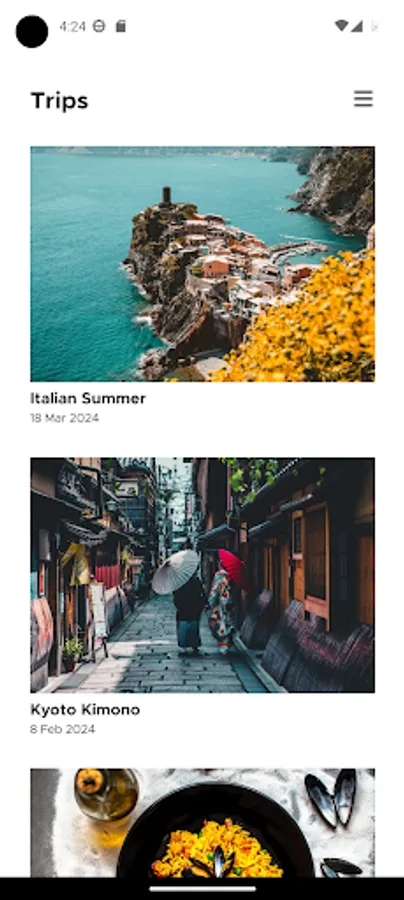 Activities are coloured by day. Your images and notes for all activities will all be here. Tap to open details for an activity and tap the links to launch map directions, dial phone numbers and/or open websites.
