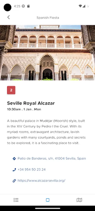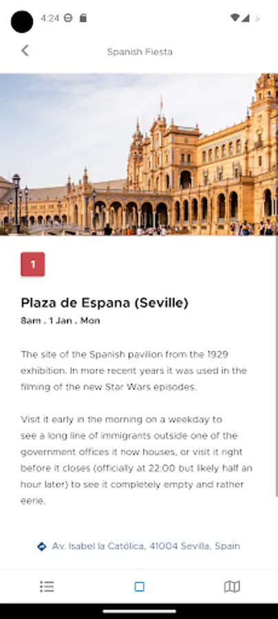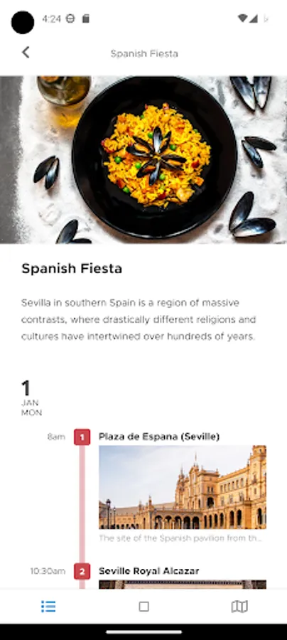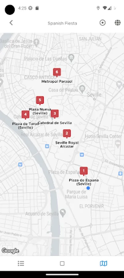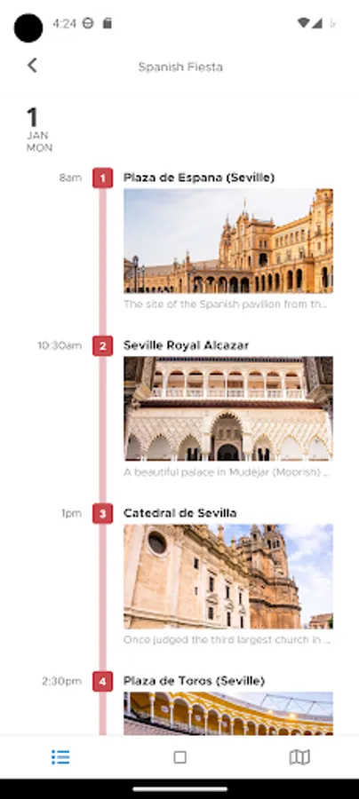 2. A large full-screen map showing markers for the place-activities on your trip. Tap a number-marker *on the map* (e.g. [1], [2], .. ) to bring up Map Directions to the place. Your current location is shown on the map (uses phone GPS, Internet not required).