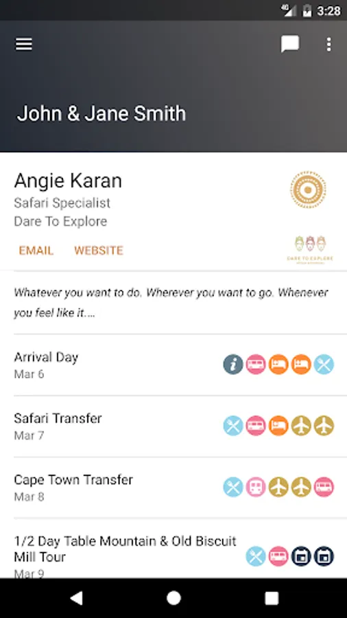 The Dare to Explore app lets you view your detailed itinerary on your Android device. No data or internet connection? No problem! All your trip details will still be there presented in a beautiful and easy to understand format.
