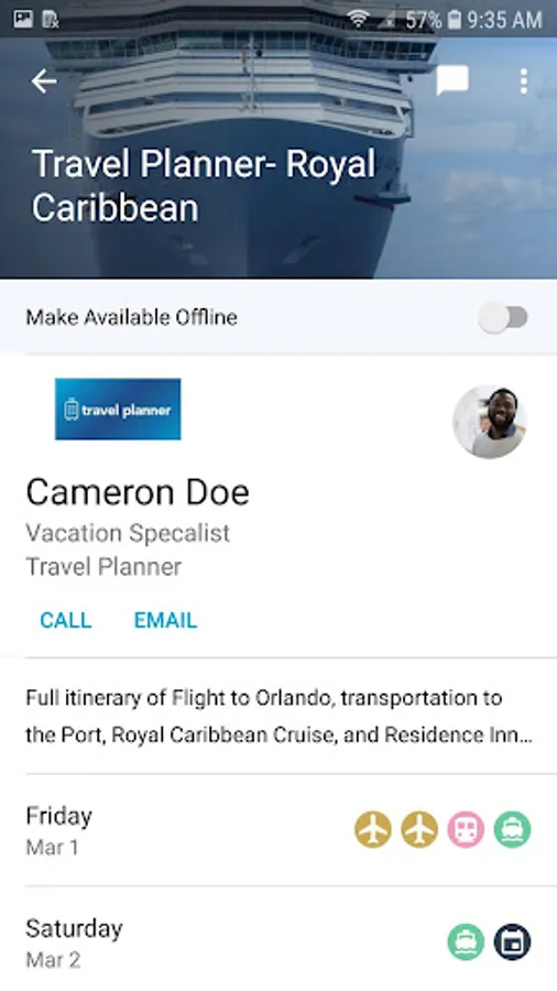 After planning your dream getaway with your vacation specialist, they will send you an itinerary for each trip they book you on complete with all relevant details and their contact information. You will have a record for all travel plans including: shore excursions, tour details, dining reservations, accommodations, departures, arrivals and anything else you and your vacation specialist have planned for your amazing getaway. Your vacation specialist will provide the information on hotels, flights, cruises, restaurants, landmarks and more! Itineraries get synced into this app so you can make sure you are on time to have a great time every time.
