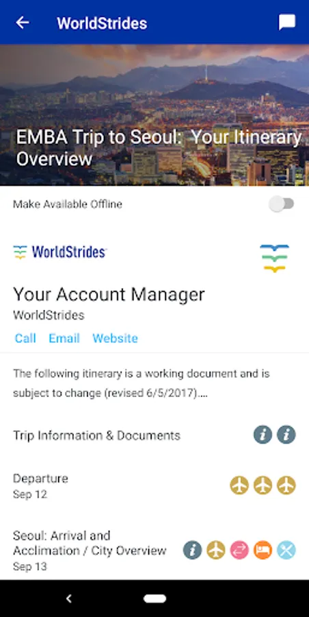 The WorldStrides app lets you view your detailed itinerary from your Account Manager on your phone. No data or internet connection? No problem! All your program details will still be there presented in a beautiful and easy to understand format.