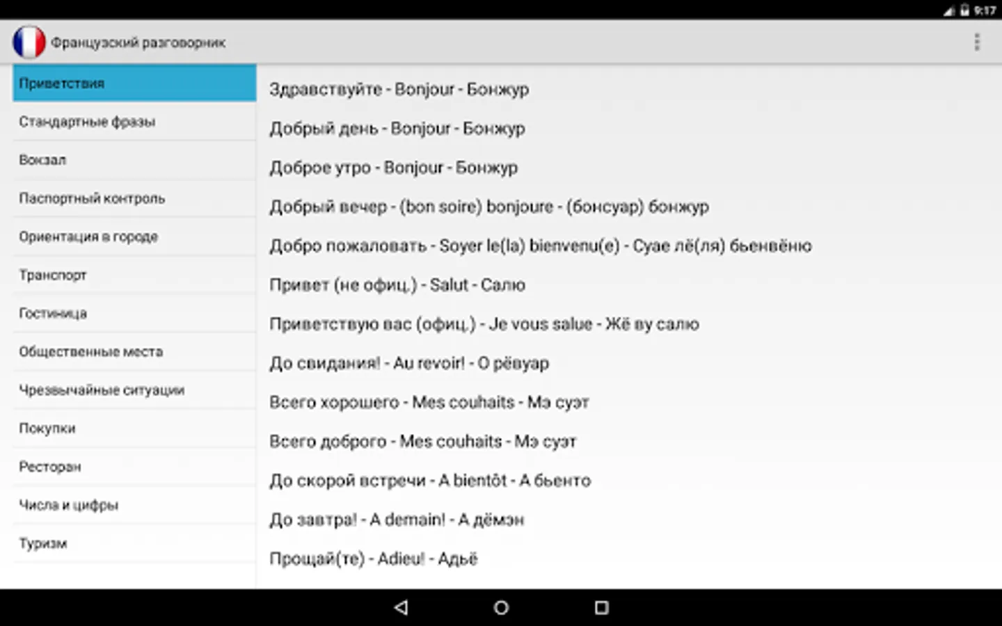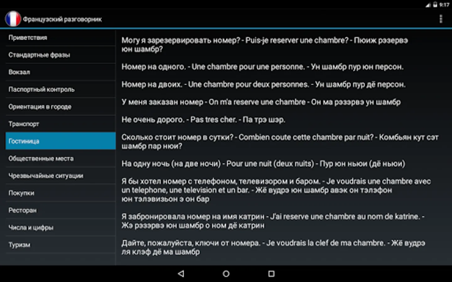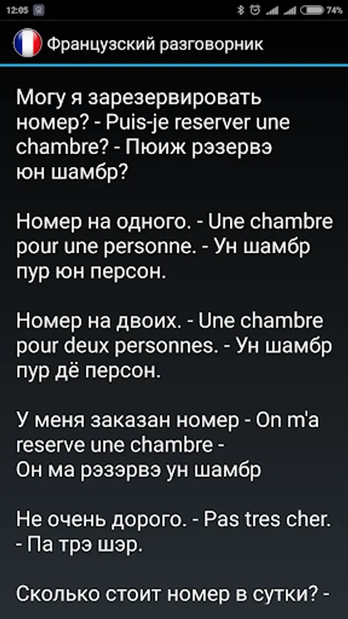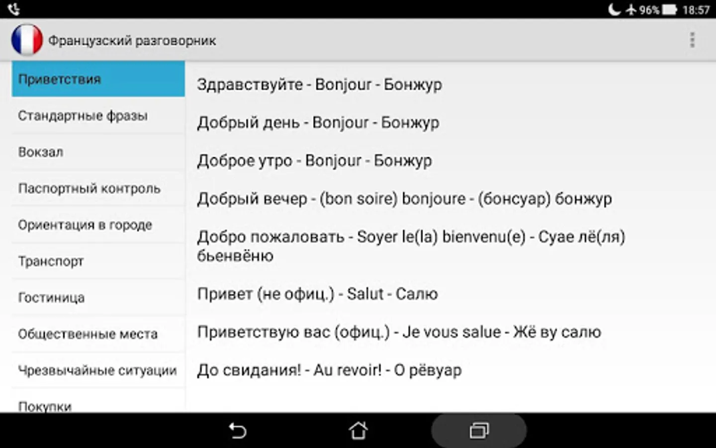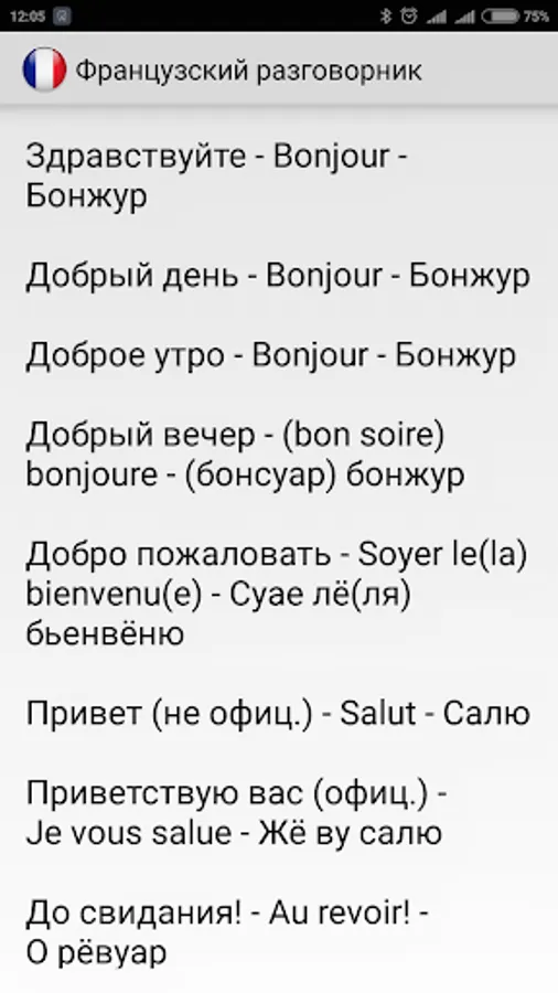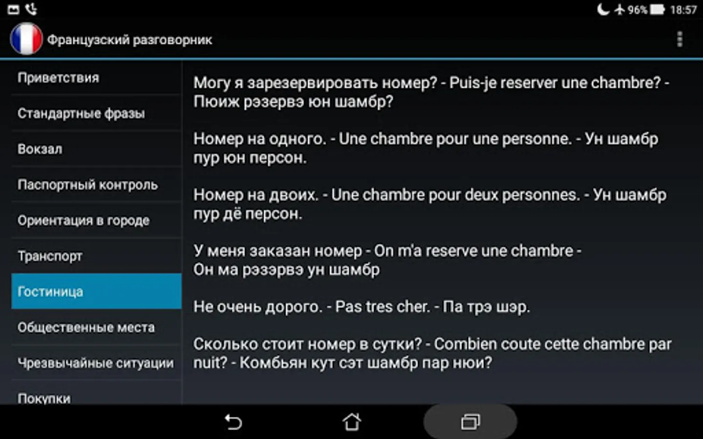 Simple offline Russian-French phrasebook. Help Russian-speaking tourists to communicate with the local population in France, as well as in other French-speaking countries. For example, in Mali, Monaco, the Central African Republic, Madagascar and others.