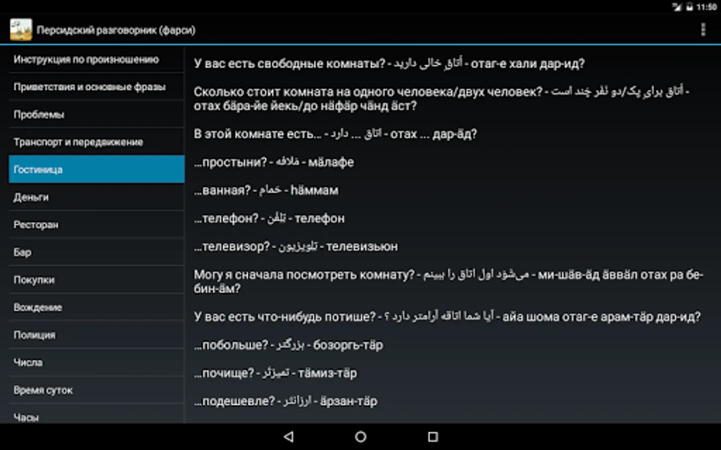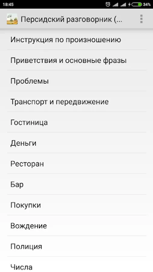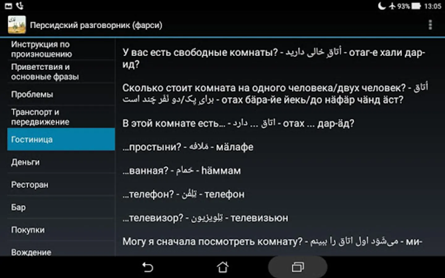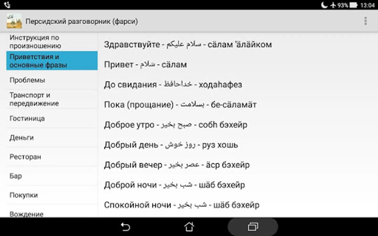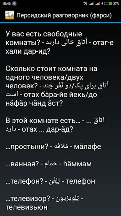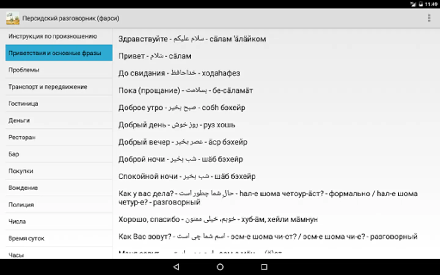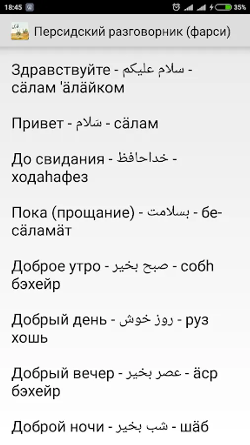 Simple offline Russian-Persian phrasebook (Farsi). Help Russian-speaking tourists to communicate with the local population in Iran, Afghanistan and Tajikistan. And as in Iraq, Bahrain, Kuwait, Pakistan, Uzbekistan and other countries.