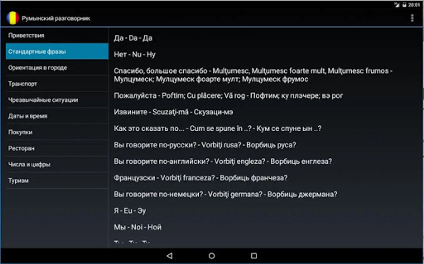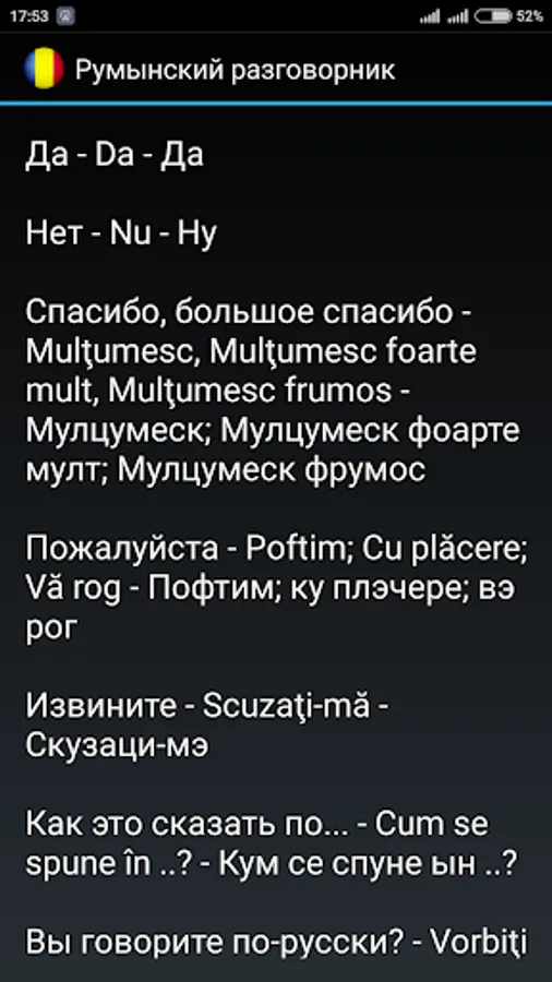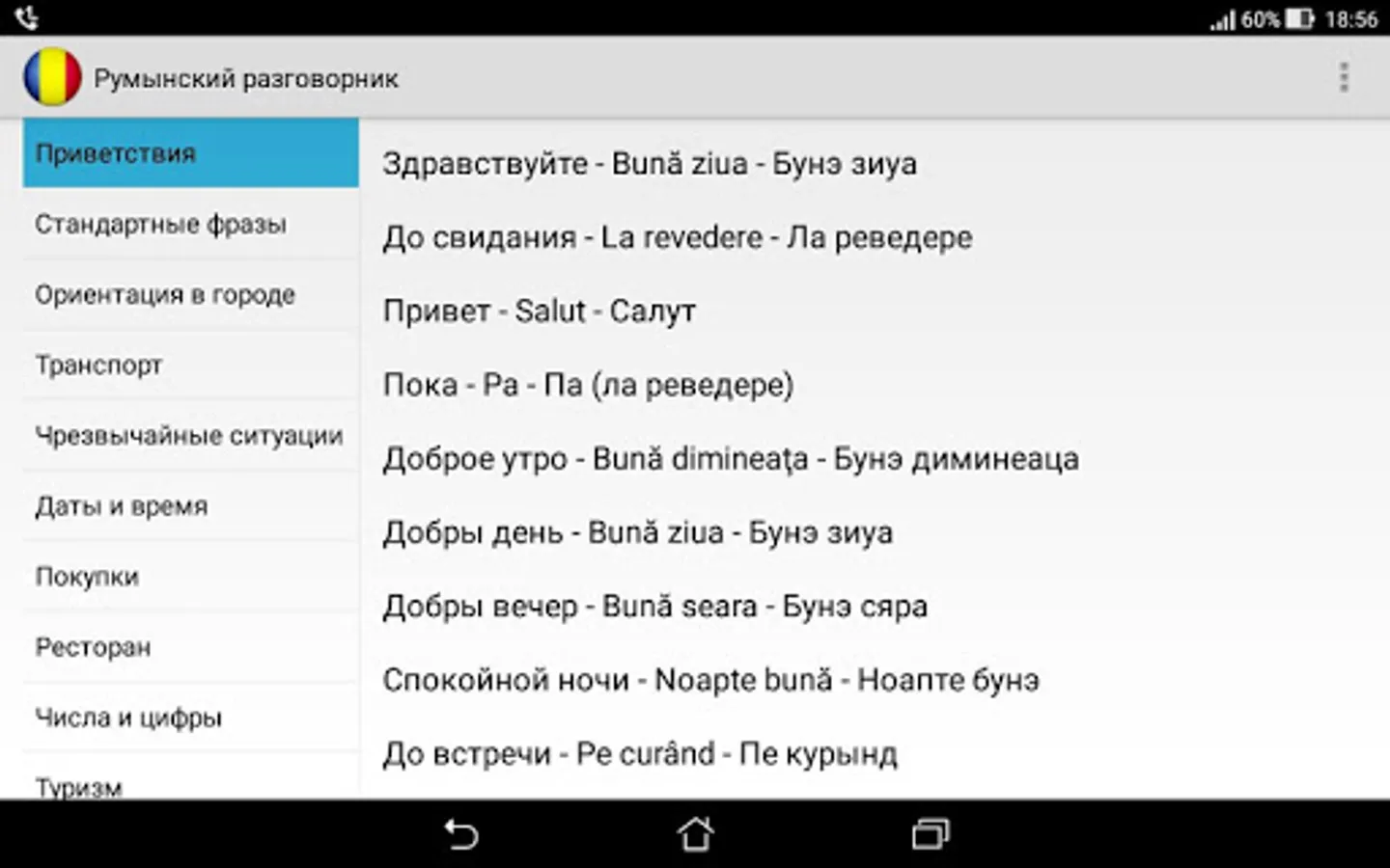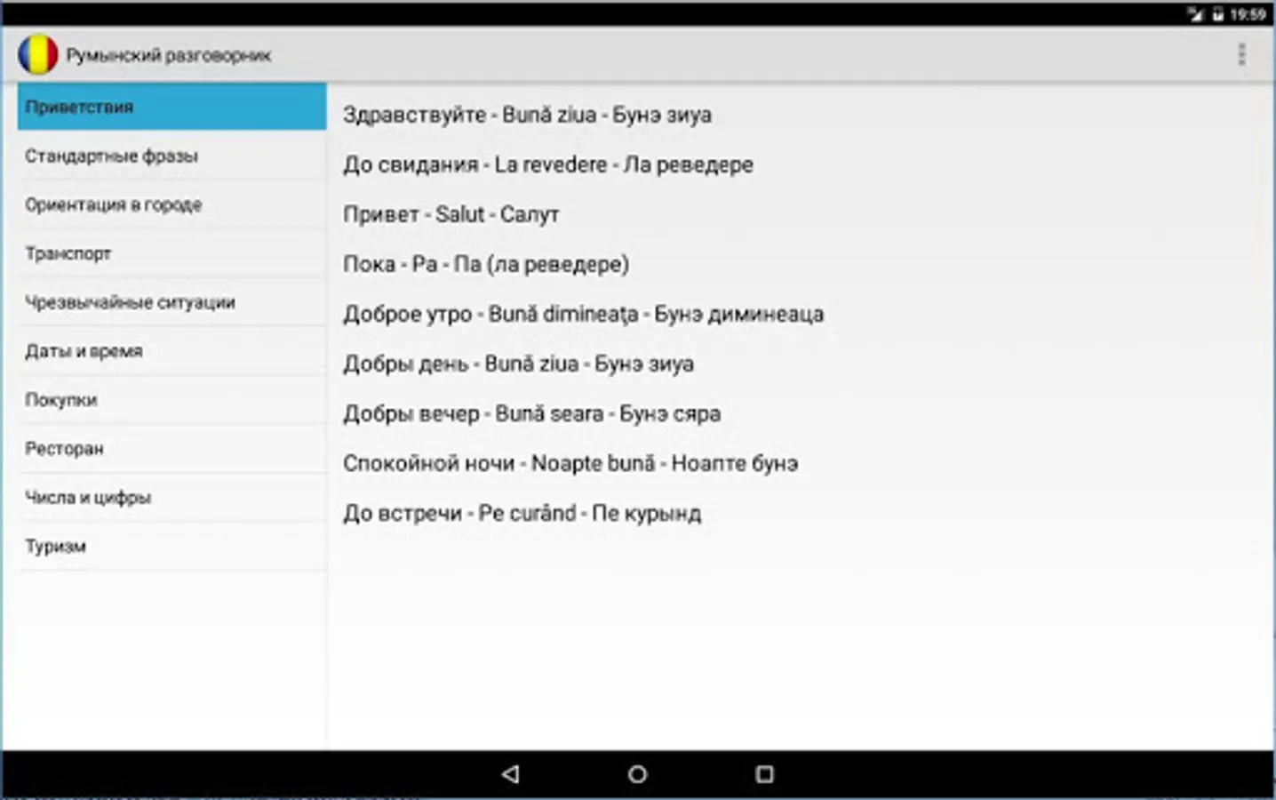 Simple offline Russian-Romanian phrasebook. Help Russian-speaking tourists to communicate with the local population in Romania.