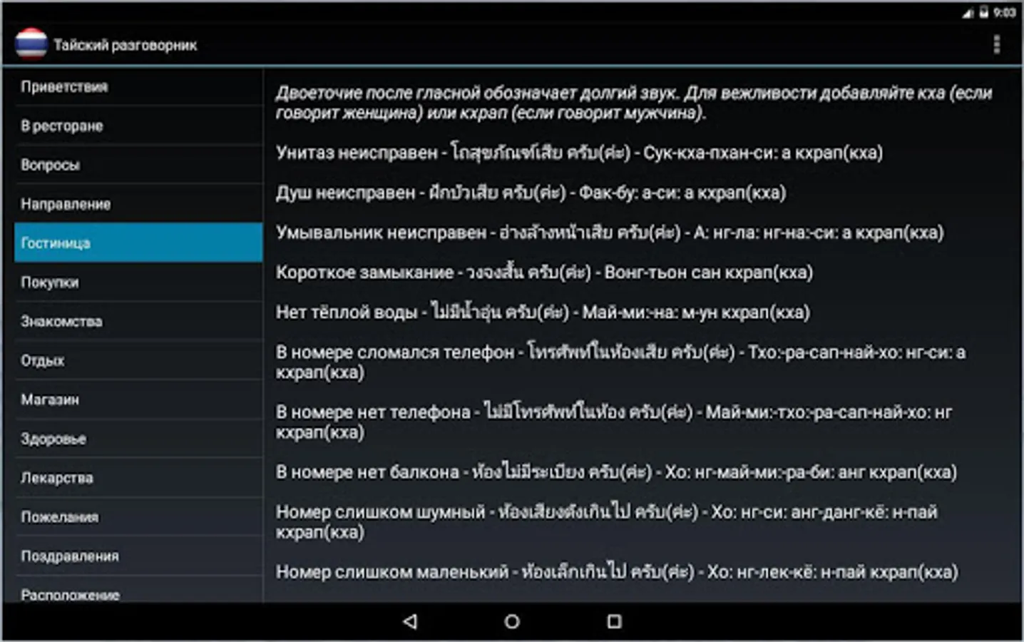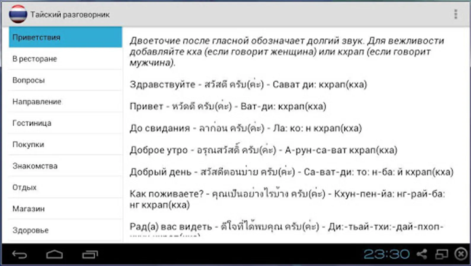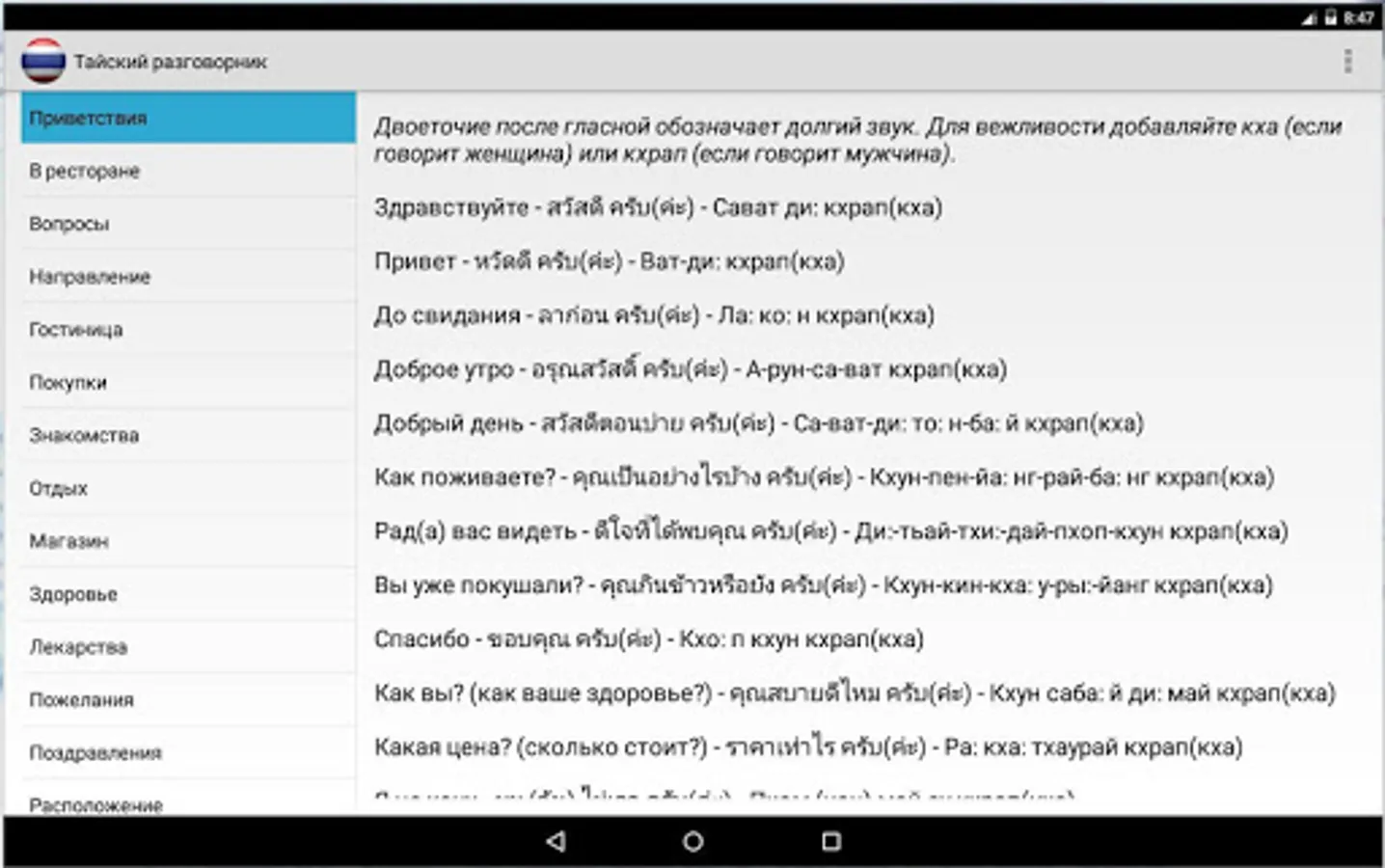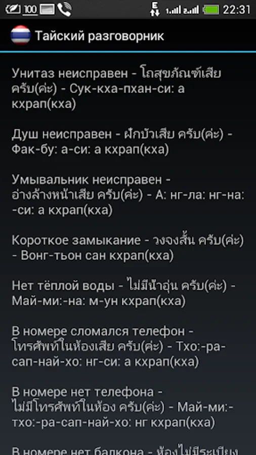Simple offline Russian-Thai phrase book. Help Russian-speaking tourists to communicate with the local population in Thailand.