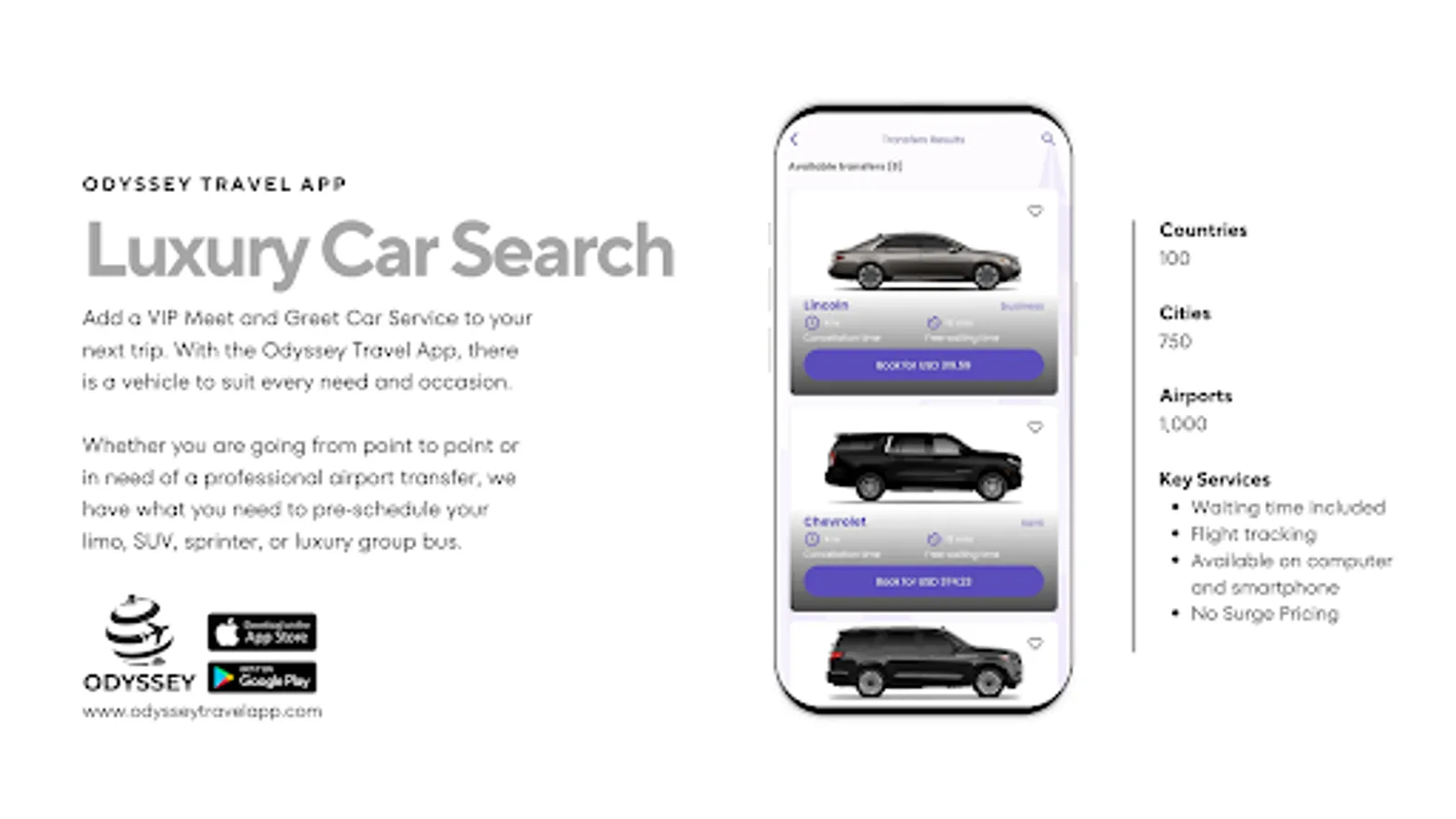 Arriving in style is now within your reach. Odyssey connects you with top-notch limousine services, ensuring a comfortable and stylish journey to your destination. Whether you need airport transfers, chauffeured tours, or a special ride for a memorable occasion, our app has got you covered. Experience the luxury of hassle-free limousine bookings with Odyssey.