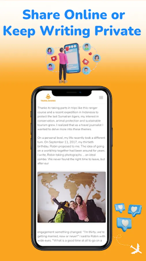 Keep a secret diary, or choose which chapters you'd like to share publicly. The travel notebook app automatically converts your daily journal into an online travel blog.