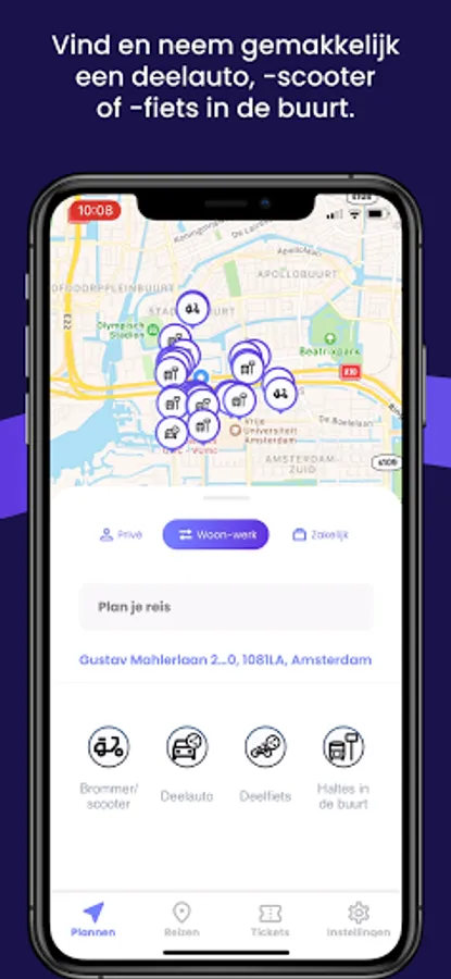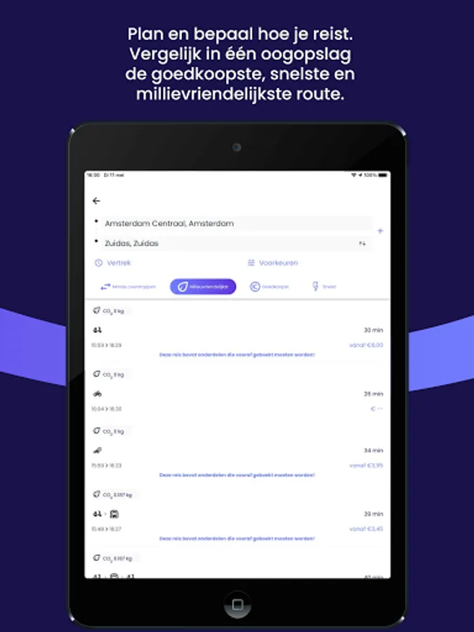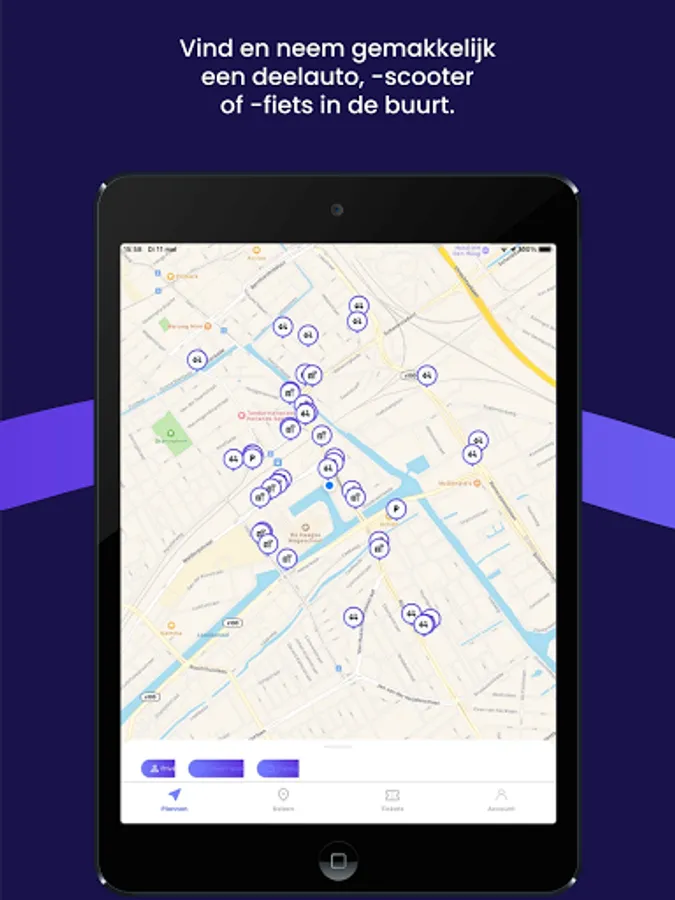 Any form of transport can be booked with the mobile app. An Amber shared car, a Felyx e-scooter, a VanMoof e-bike, the tram, train or an electric taxi with a quality driver. More than 30 wheel operators are now connected to our platform.