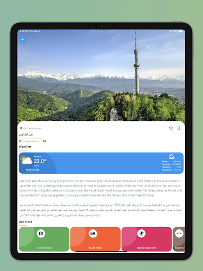 Hotels hotels, Restaurants and cafes, The gardens and parks, Commercial complexes, Popular markets and bazaars, Hospitals, pharmacies, weather, prayer times and currency rates.