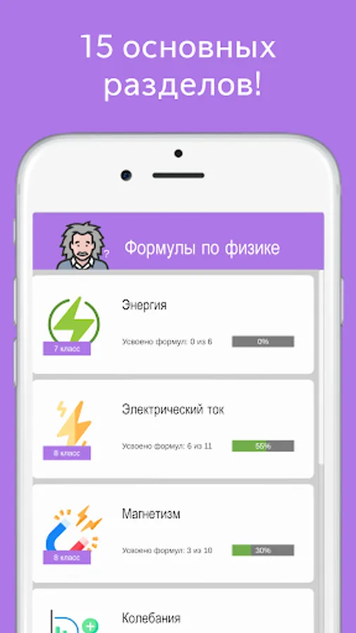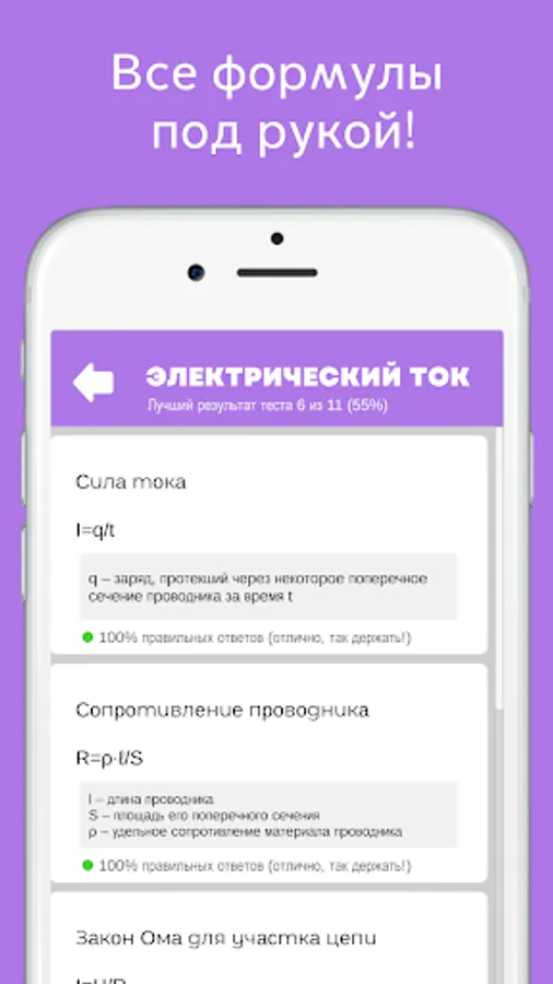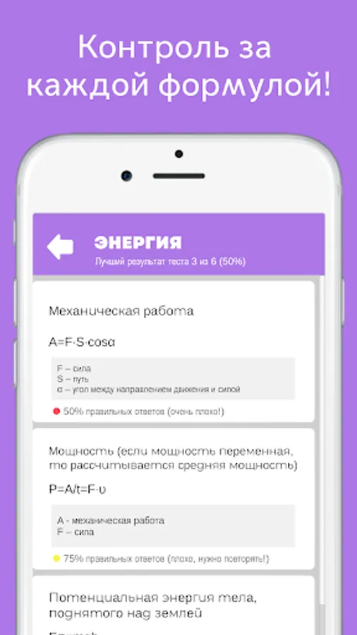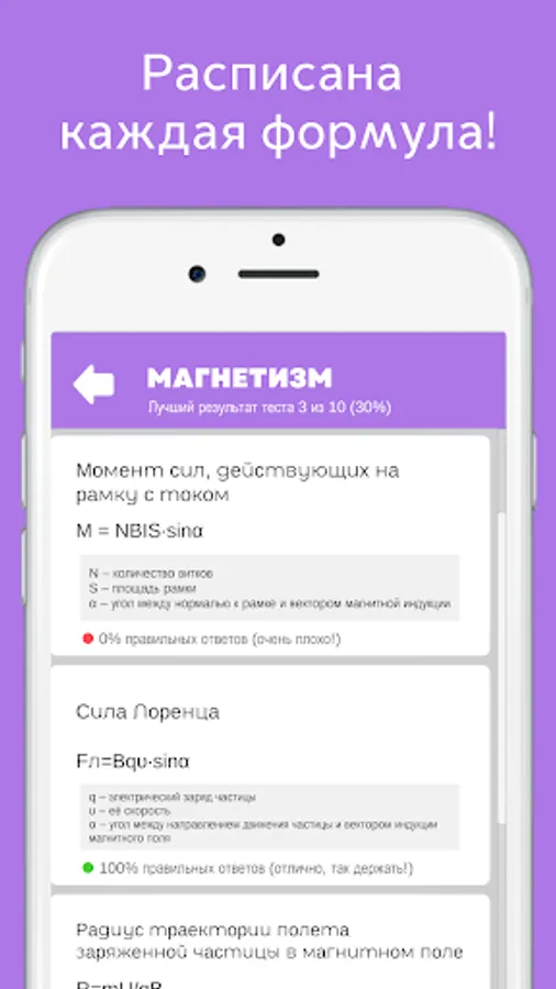 Physics formulas are also suitable for the OGE and the Unified State Examination, under each formula there is a detailed description, that is, each letter is signed, as well as a percentage and a color indicator of how well you know this or that formula.