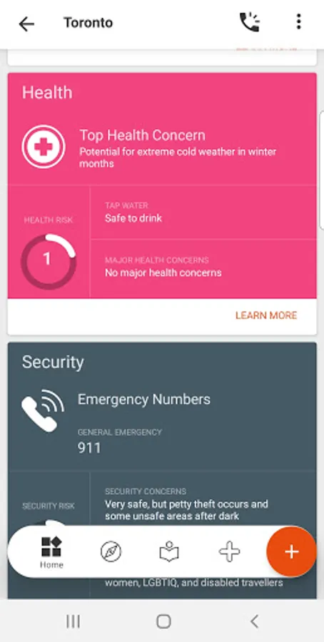 - Security: Local emergency numbers, real-time alerts, plus safety information including crime, climate, and other hazards