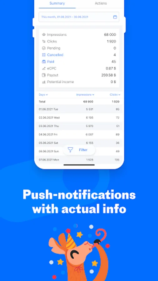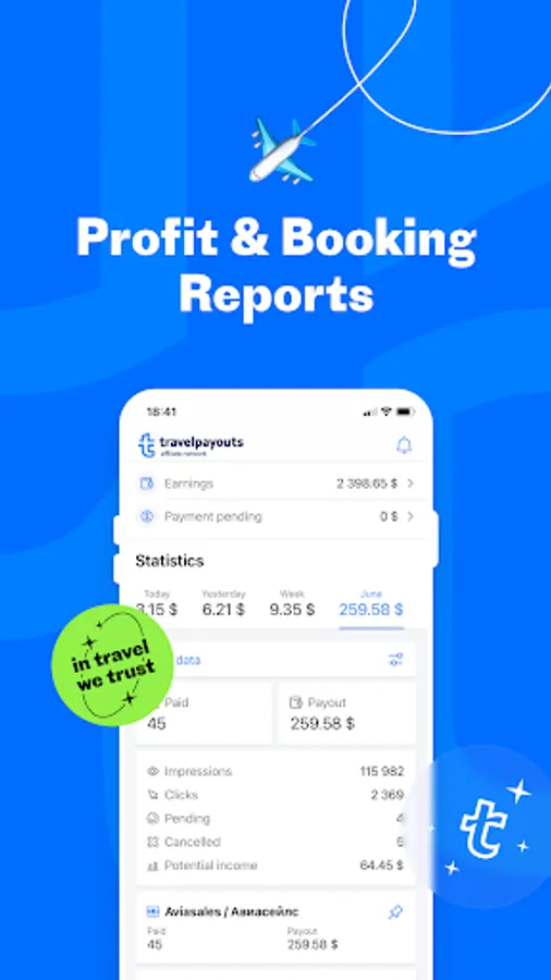 In addition to tracking sales and statistics, in the official Travelpayouts application, you can: