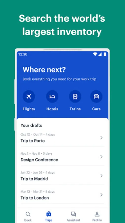 What’s more, it’s your business travel itinerary in your pocket. Get instant access to booking confirmations for your flights, hotels, trains, and rental cars. Never print passes or tickets again, and store every detail of your trip in one place.