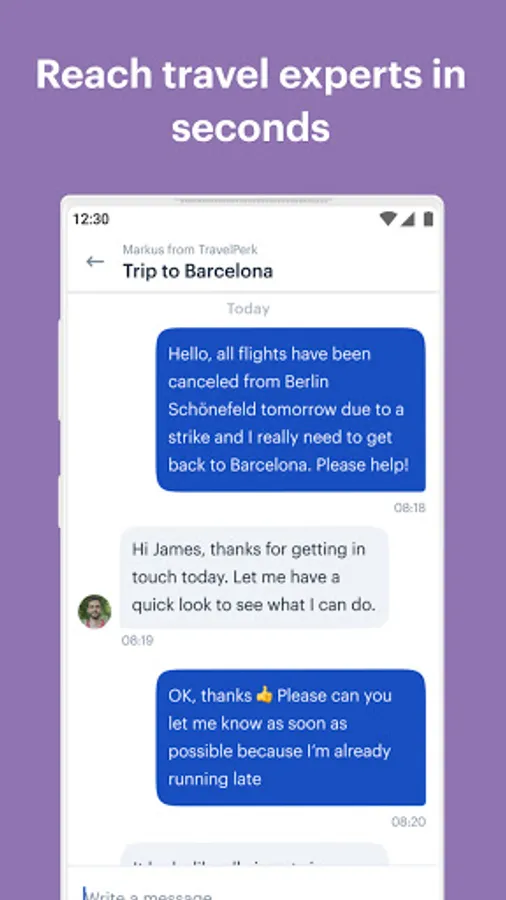Traveling for work just got better! The TravelPerk Trip Assistant is here to make sure that all your travel plans go smoothly. It’s your direct line to real travel agents (never chatbots), no matter where you are in the world, and no matter the time of day or night. Connect with our experts in just a couple of taps to get quick answers to all your questions and queries.