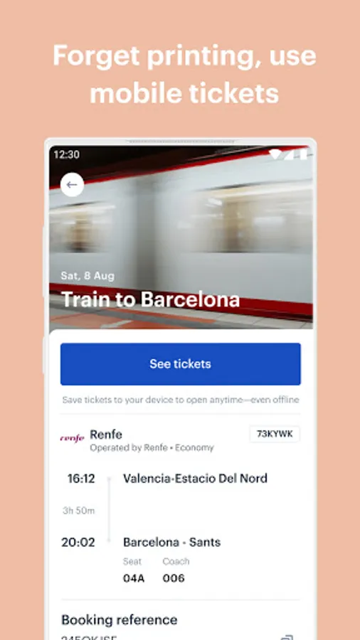 Sail through security with tickets and passes on your phone, and get instant, paperless confirmations for all your trips. No need to print!