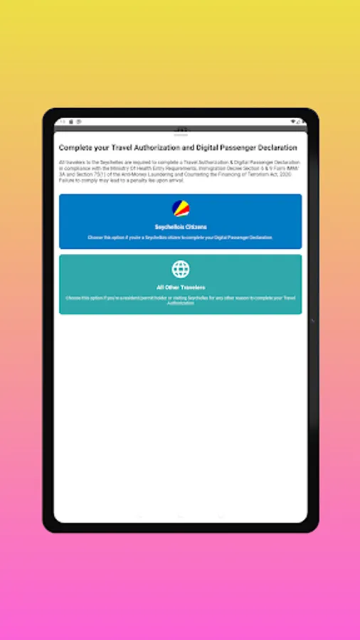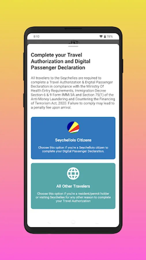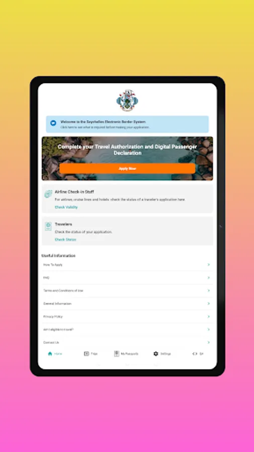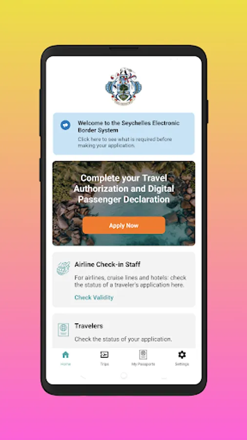 Complete all your border procedures with the official Seychelles e-Border government app.